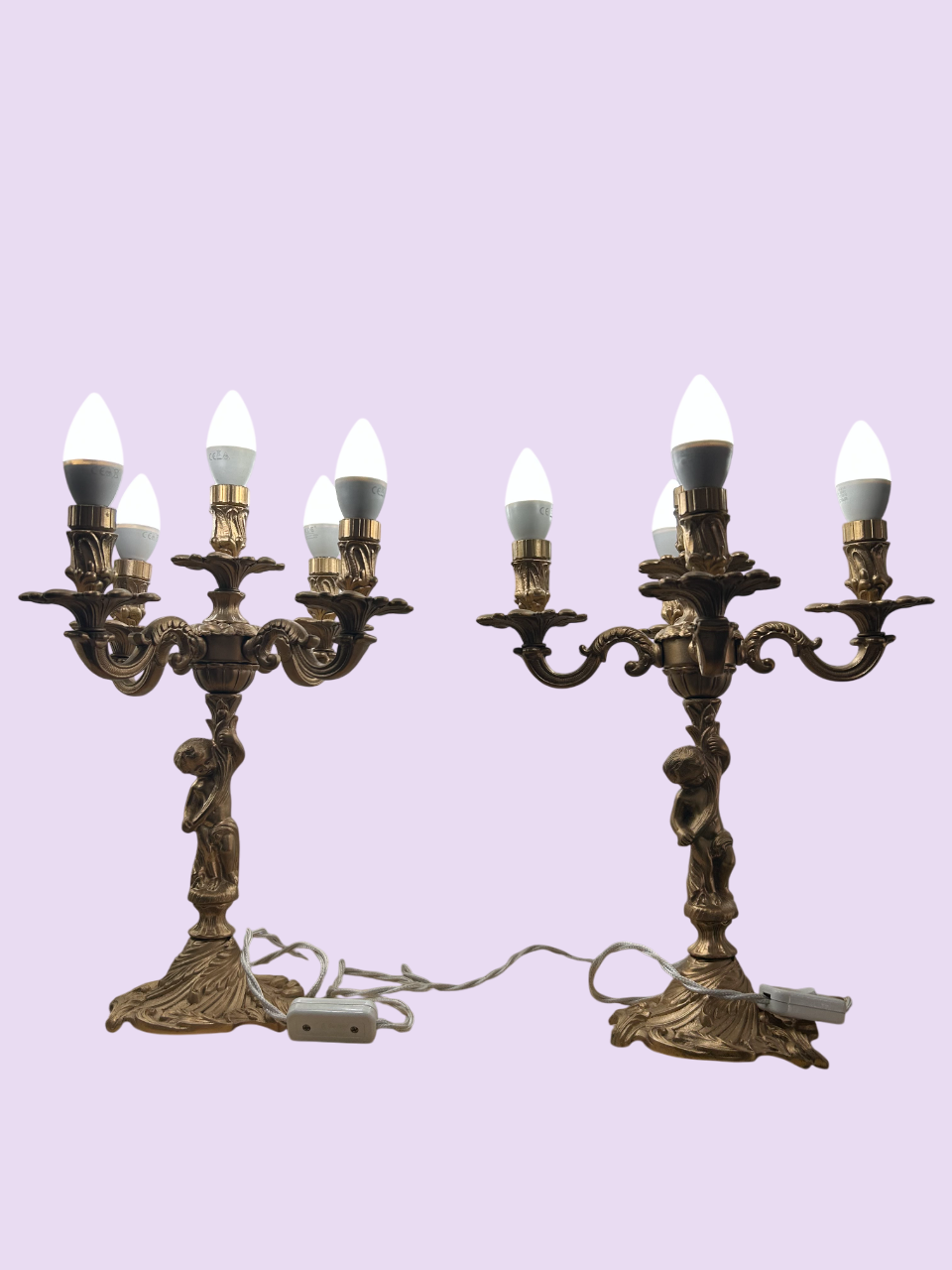Pareja de candelabros dorados pequeños con 4 bombillas cada uno, perfectos para decorar e iluminar cualquier espacio con estilo elegante y sofisticado.