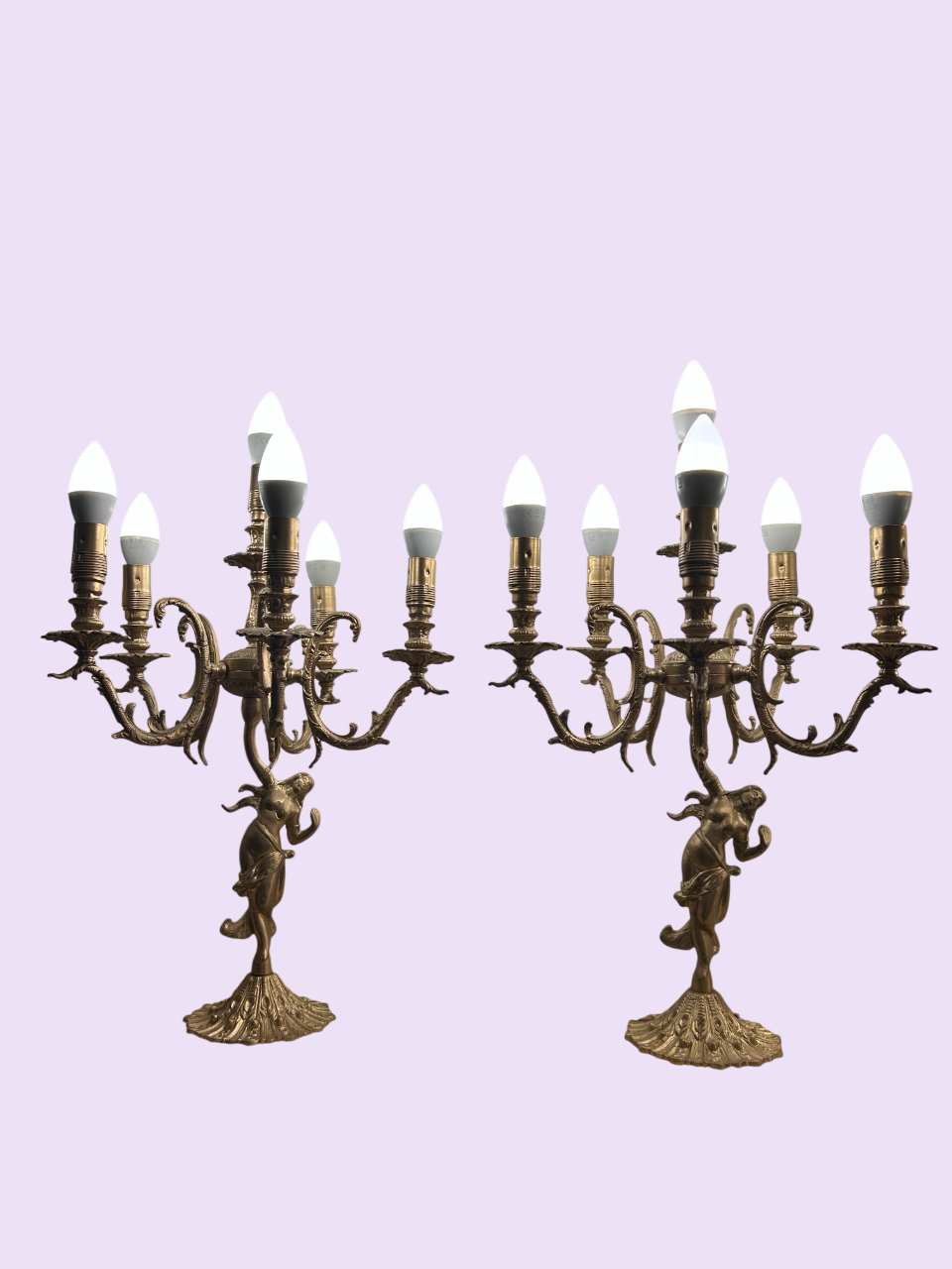 Pareja de candelabros dorados grandes con 6 bombillas cada uno, perfectos para decorar e iluminar cualquier espacio con estilo elegante y sofisticado.
