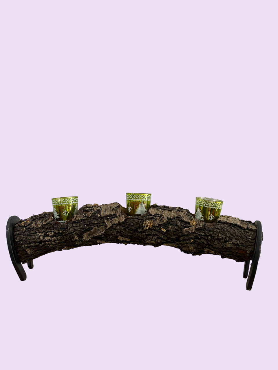 Tronco portavelas artesanal, hecho a mano, ideal para decorar con estilo rústico y aportar un toque natural y acogedor a cualquier espacio. Con tres velas y dos herraduras a cada lado.