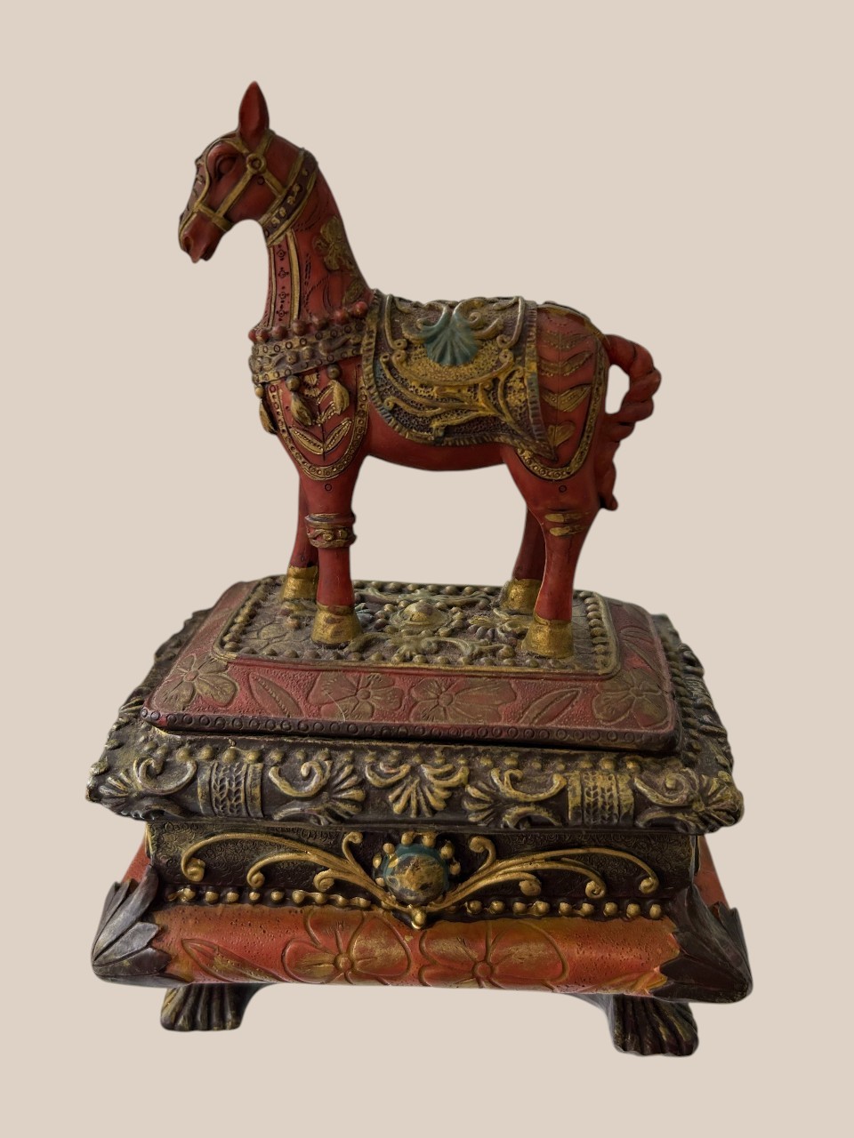 Guarda tus joyas y pequeños tesoros con estilo gracias a este delicado joyero decorativo con diseño de caballo. Su tamaño compacto lo hace ideal para mesas de noche, escritorios o tocadores, combinando funcionalidad y un toque artesanal que aporta encanto y personalidad a tu espacio.