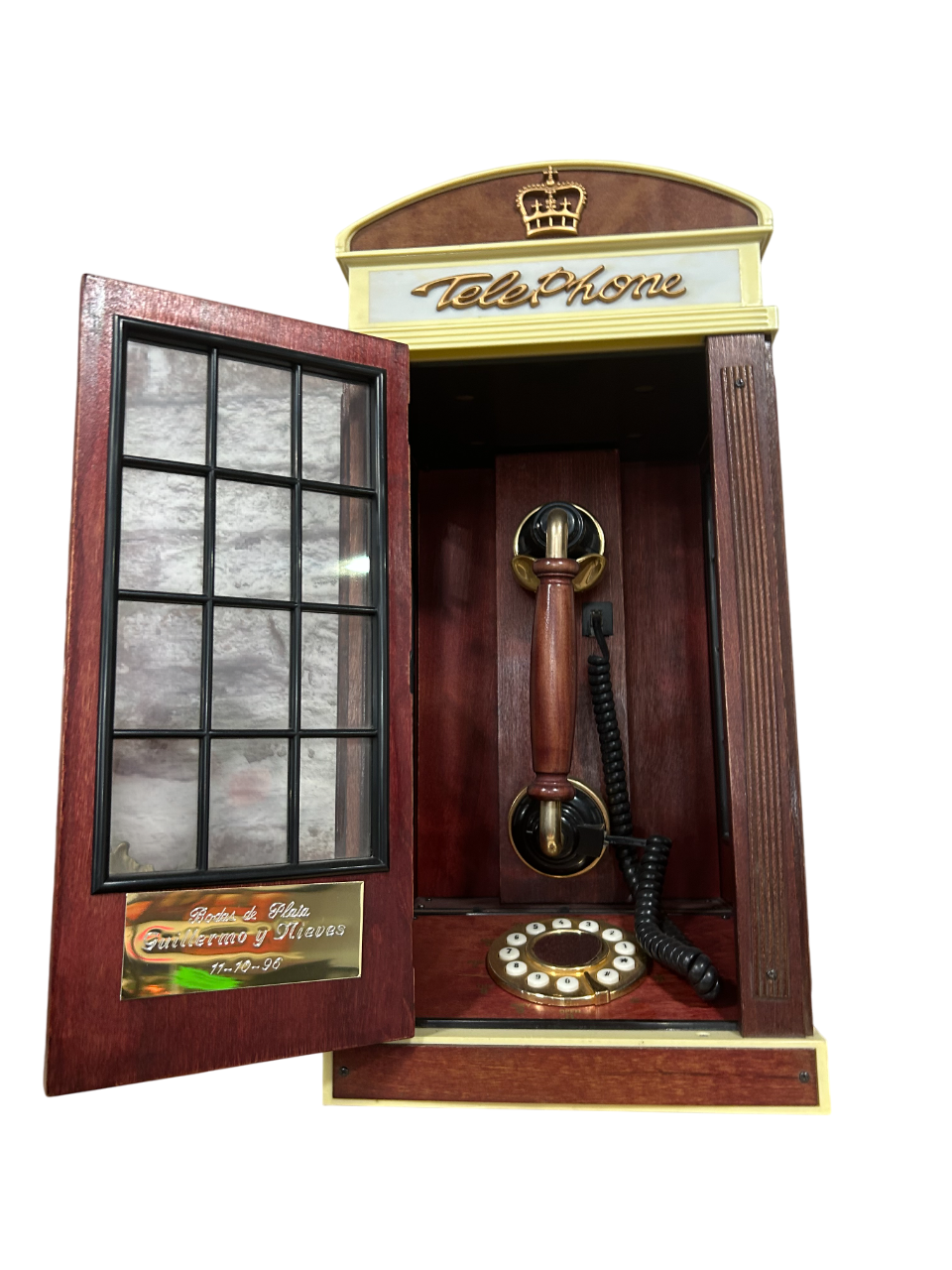 Encanto retro y urbano en una réplica de cabina londinense con teléfono, perfecta para decorar con estilo y nostalgia.