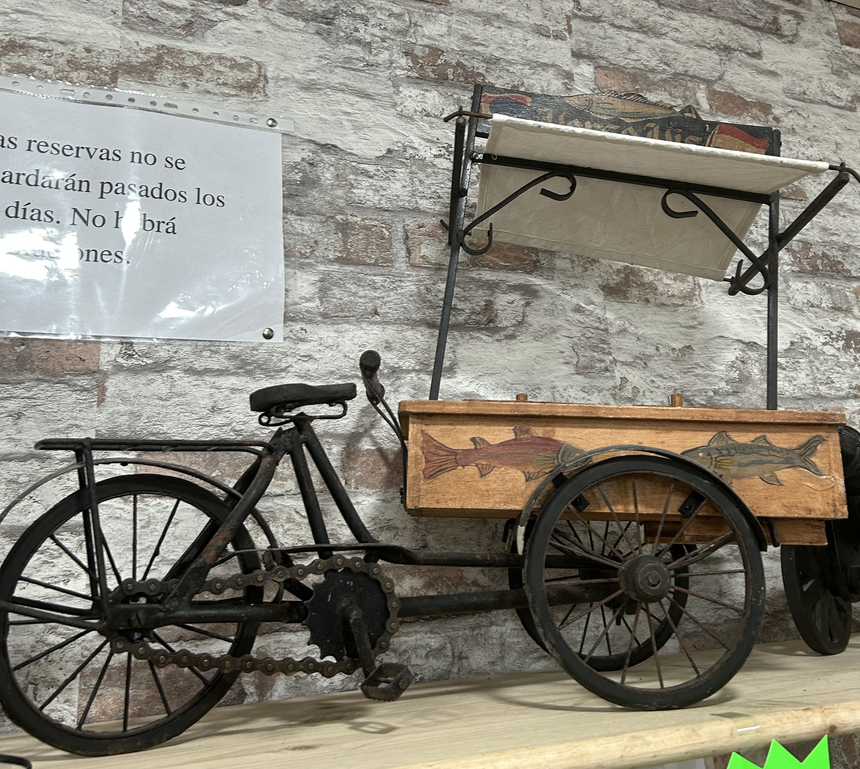 Colorida y original pieza de decoración que representa una bicicleta con carrito de venta, con divertidos dibujos de pescados. Ideal para dar un toque único y alegre a cualquier espacio.