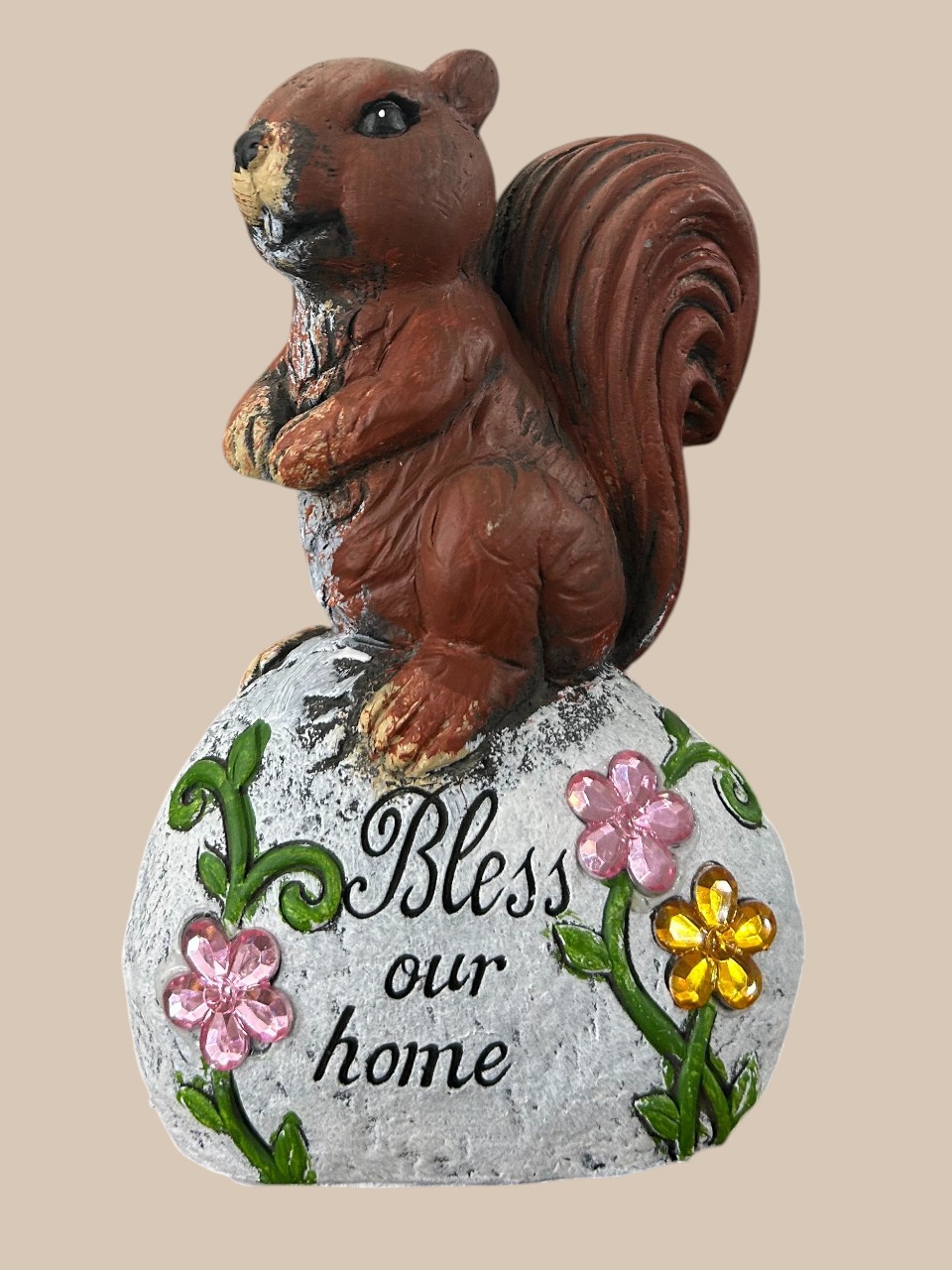 Encantadora figura de ardilla en piedra que transmite calidez y protección con el mensaje “Bless Our Home”. Ideal para decorar jardines, terrazas o interiores, agregando un toque acogedor y natural a tu hogar.
