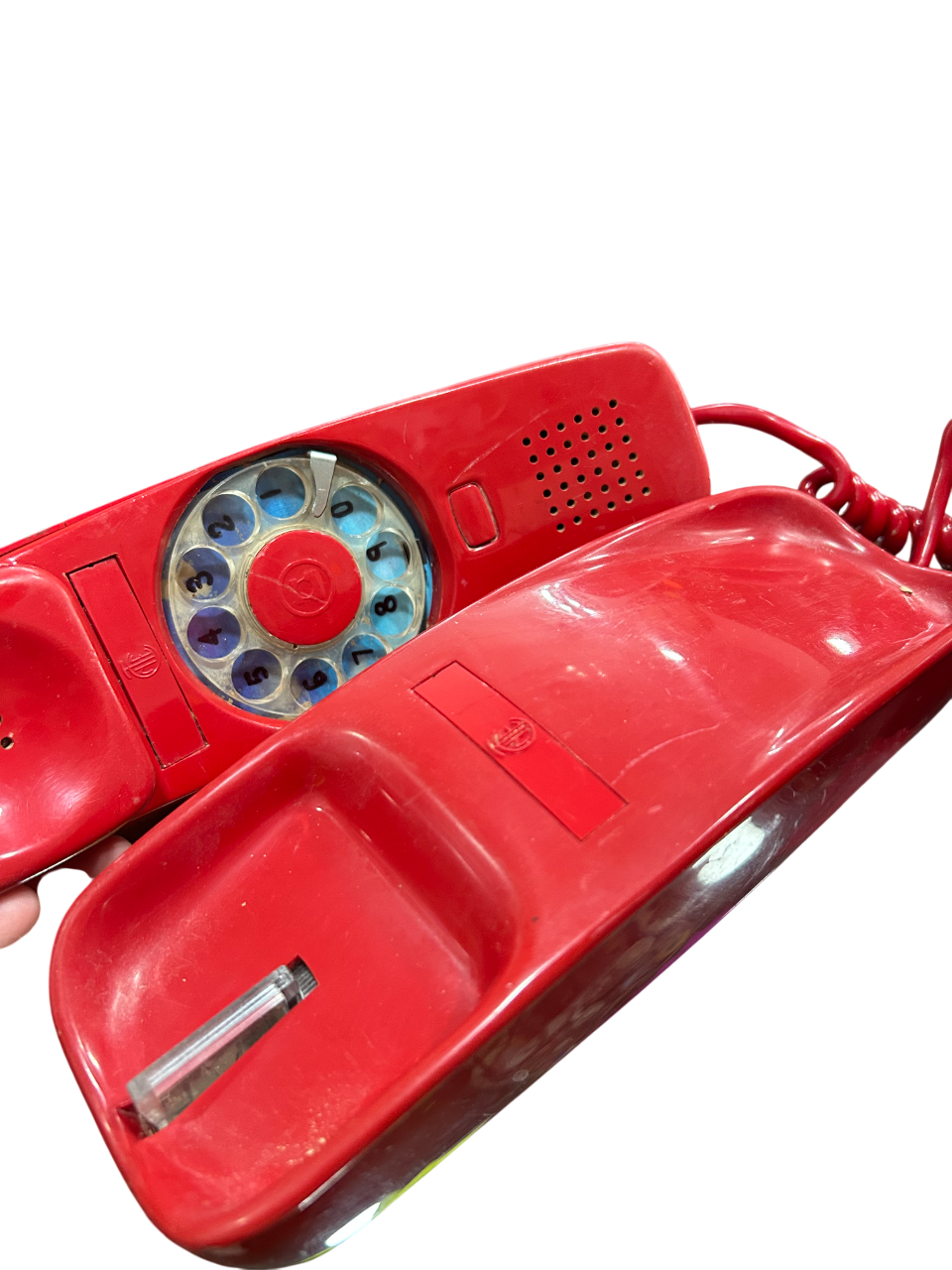 Clásico teléfono rojo con disco giratorio, ideal para decorar con estilo vintage y añadir un toque nostálgico a cualquier espacio.