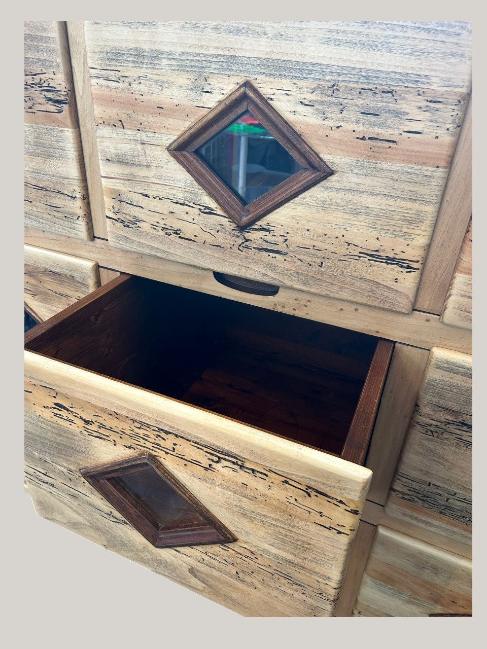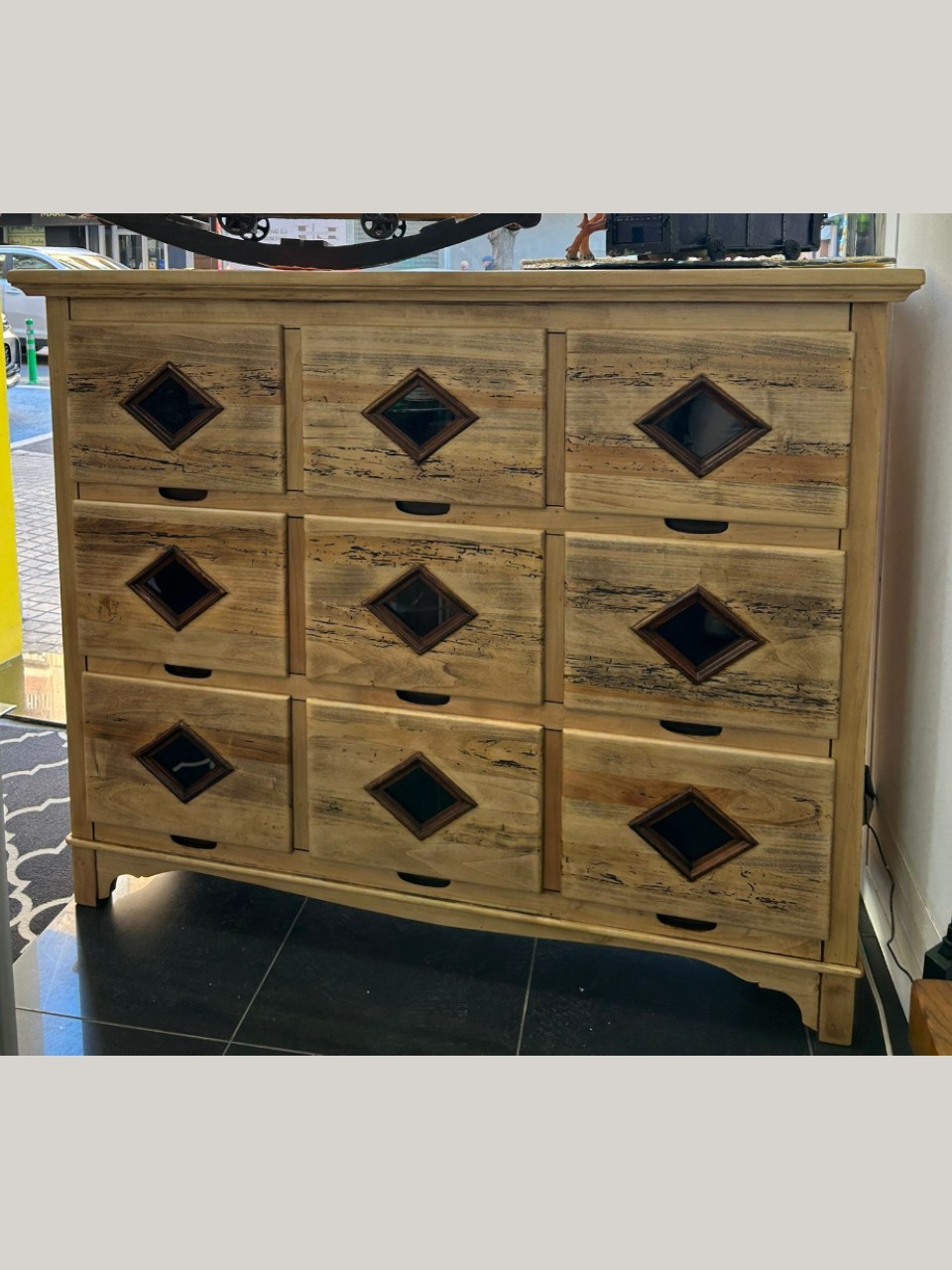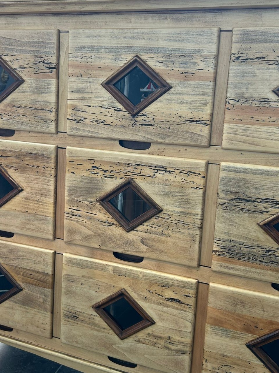Impresionante cómoda de estilo rústico fabricada en madera maciza, con un acabado natural que resalta las vetas y tonalidades propias del material. Dispone de 9 cajones amplios, cada uno decorado con un detalle central en forma de rombo con inserción oscura, aportando un toque artesanal y distintivo.