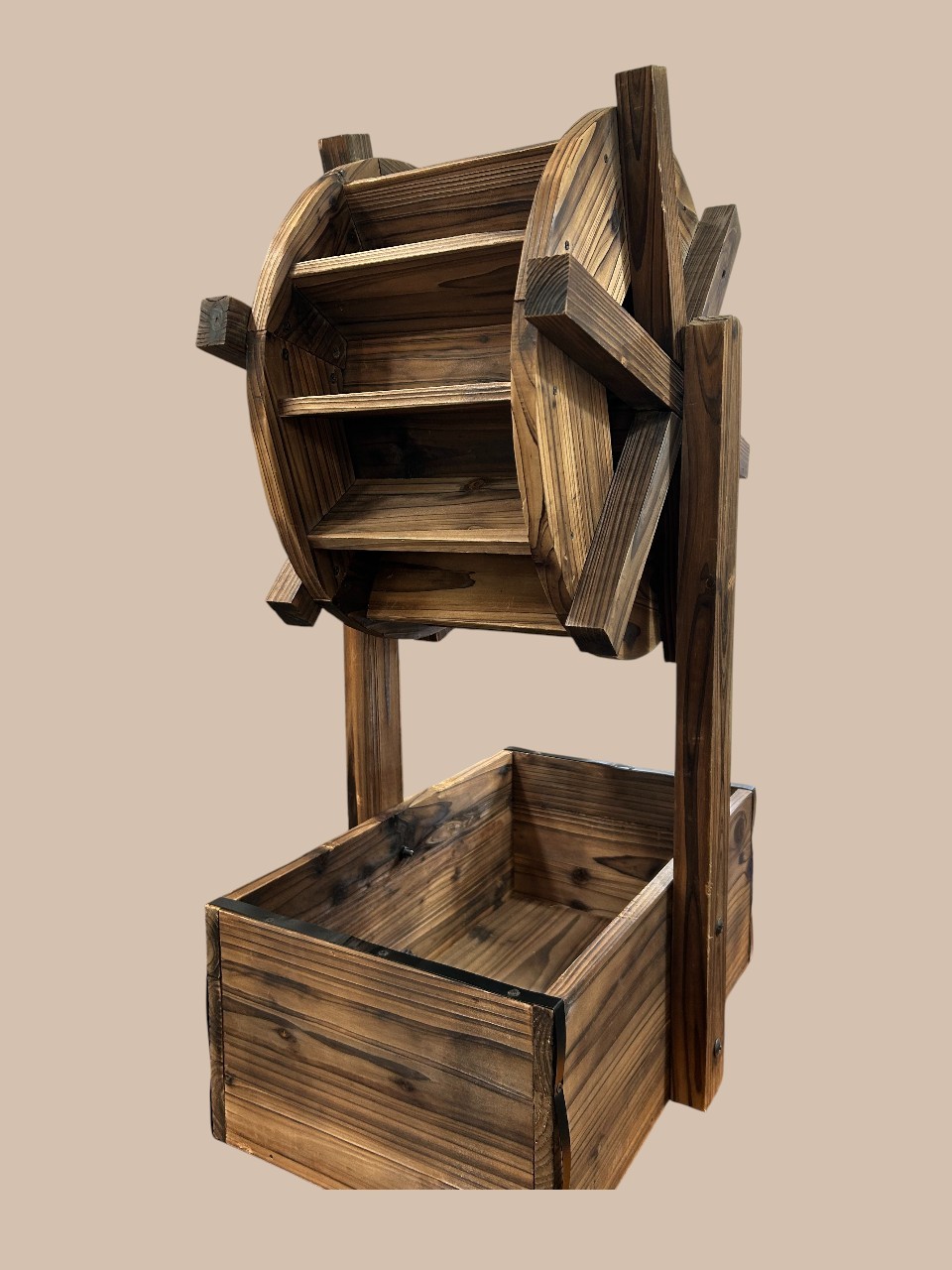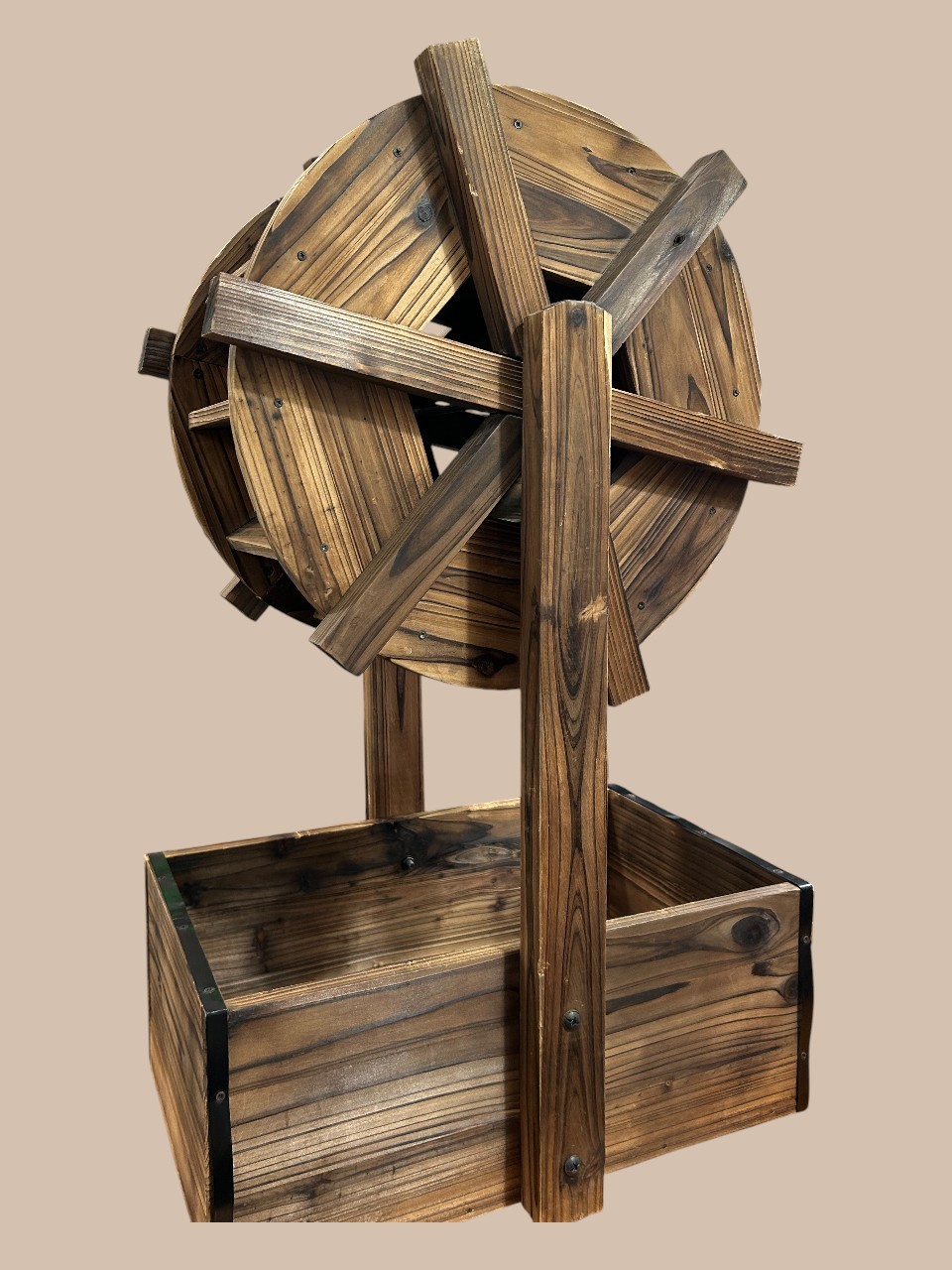 Original macetero decorativo de madera con diseño de molino, elaborado en madera natural con acabado rústico que resalta sus vetas y tonalidades. Incorpora un compartimento inferior tipo caja para plantas o flores y una estructura superior en forma de molino que aporta un toque campestre y artesanal. Ideal para jardines, terrazas, patios o interiores rústicos, este macetero es una pieza decorativa llamativa que añade encanto y personalidad a cualquier espacio.