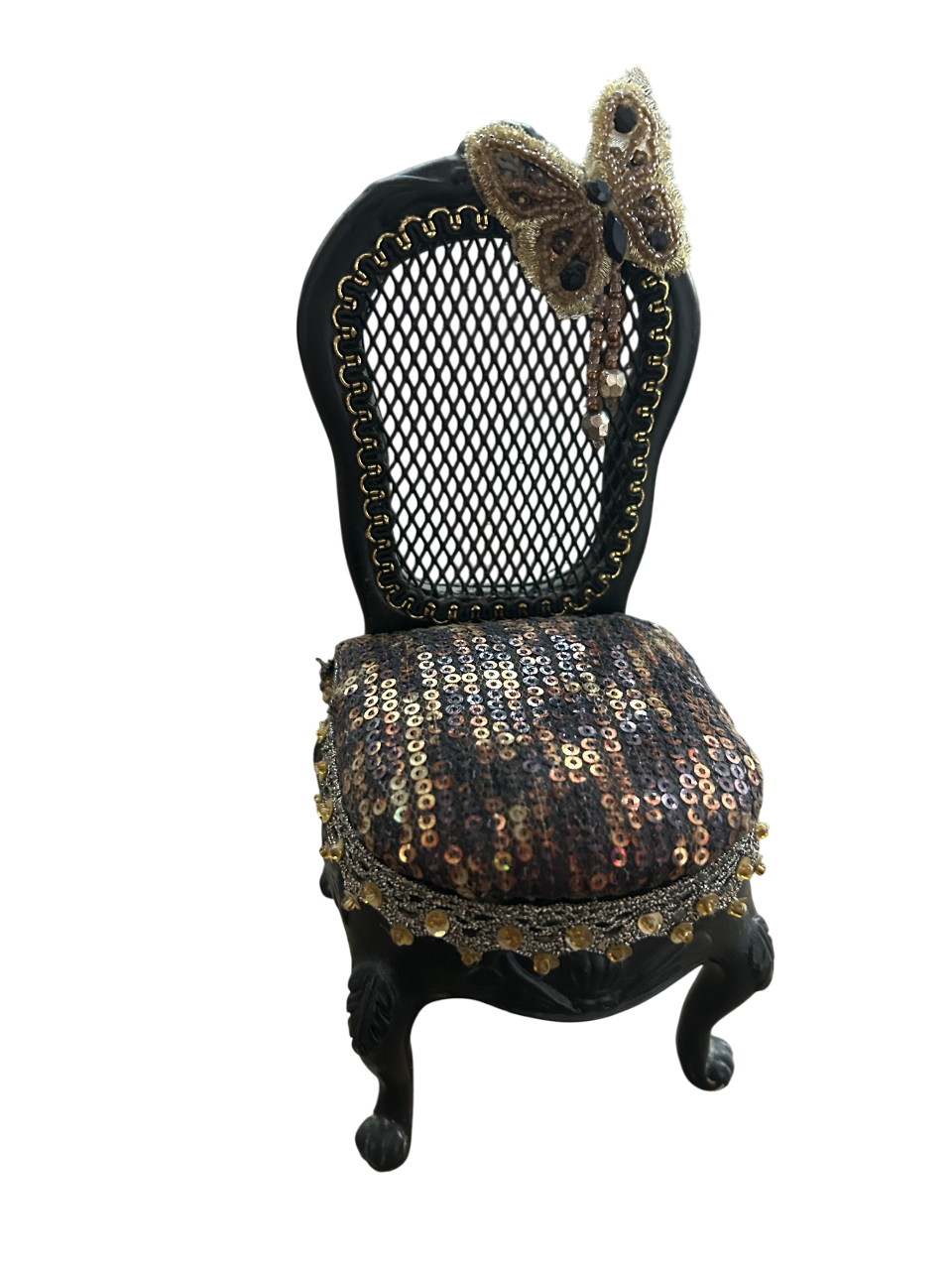 "Delicada silla joyero, perfecta para guardar anillos o pendientes, combinando funcionalidad y encanto decorativo en un solo detalle.
