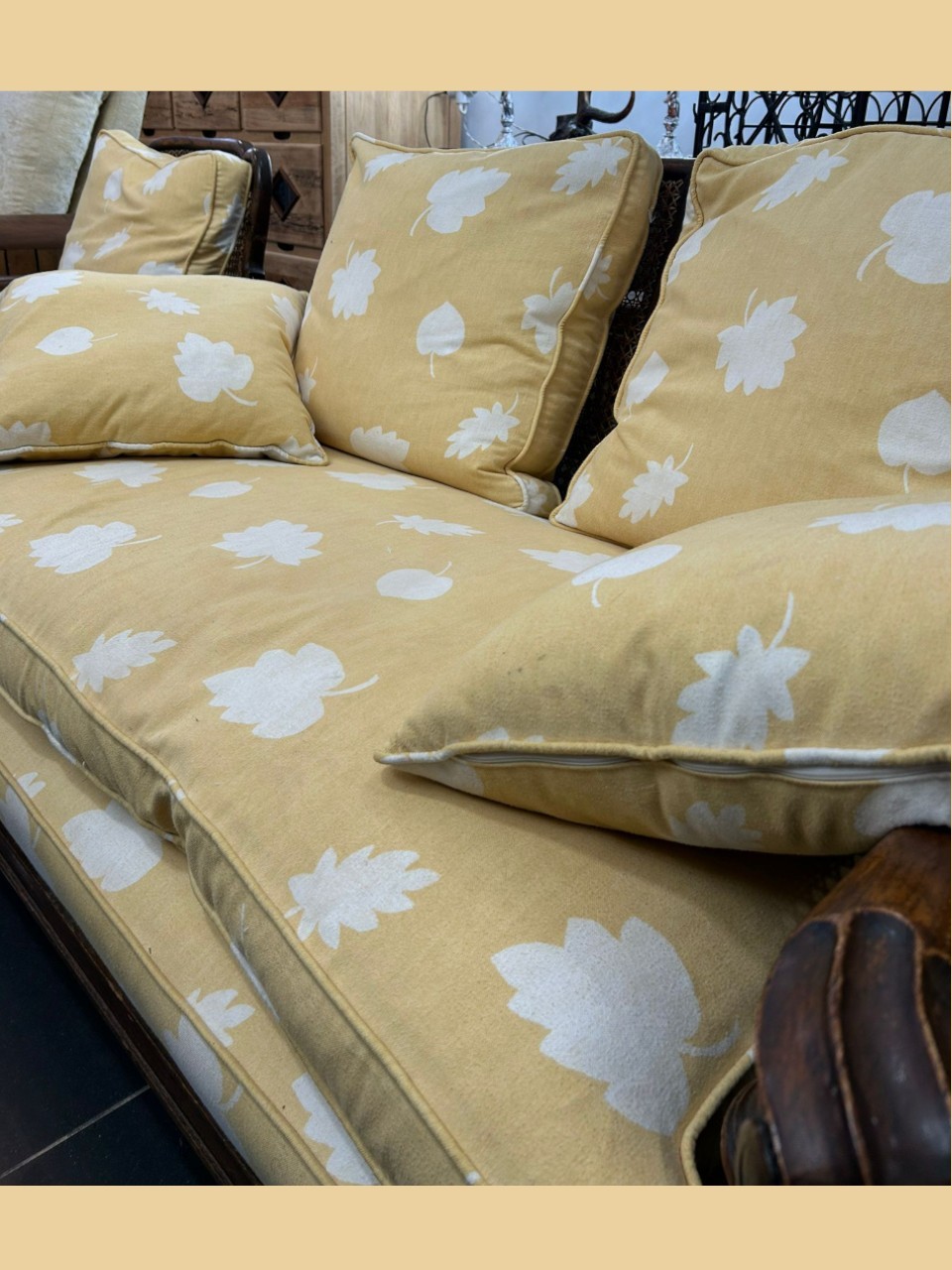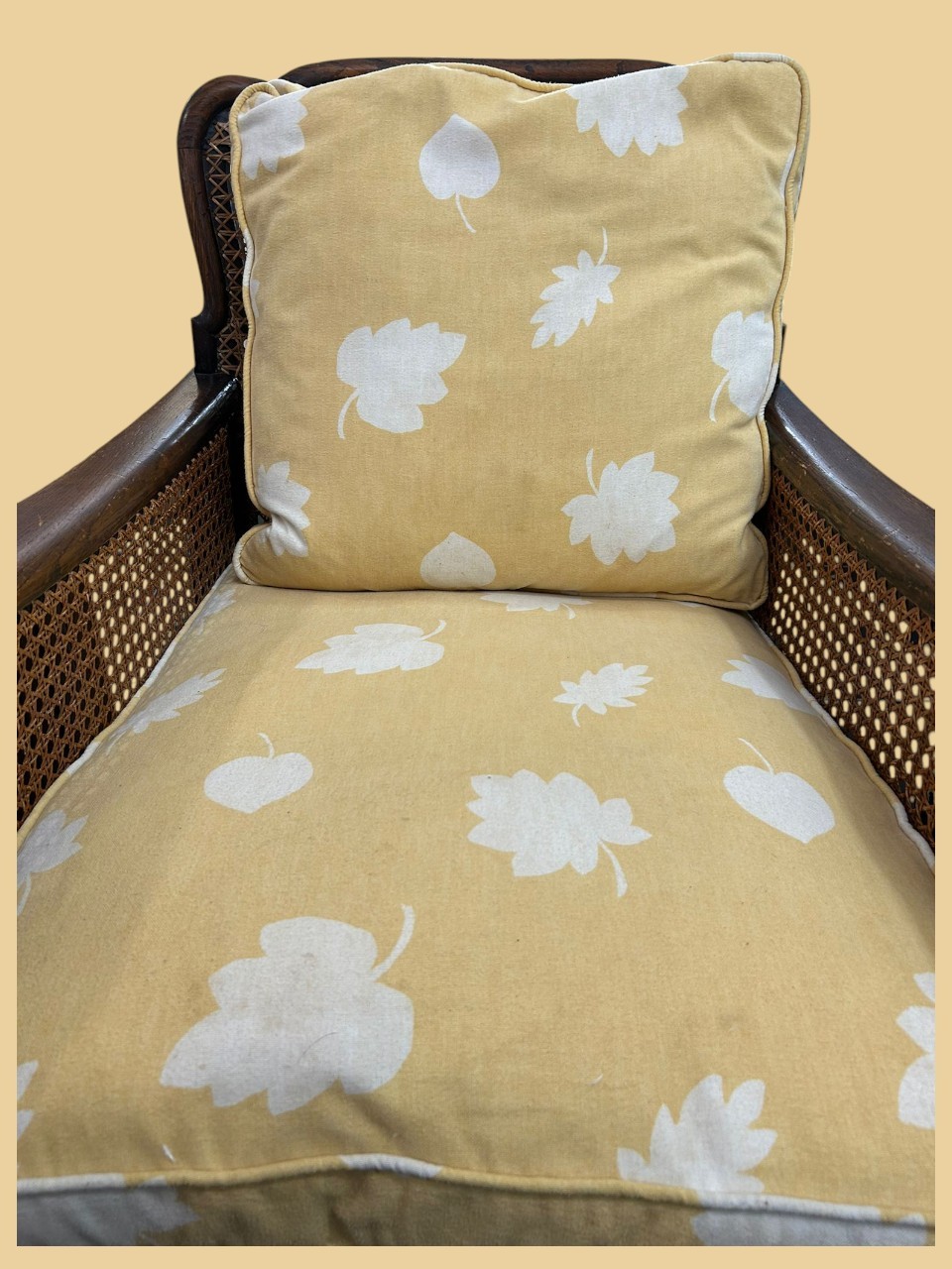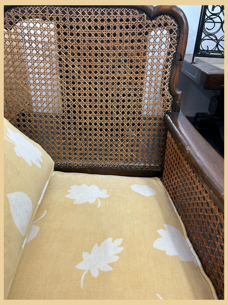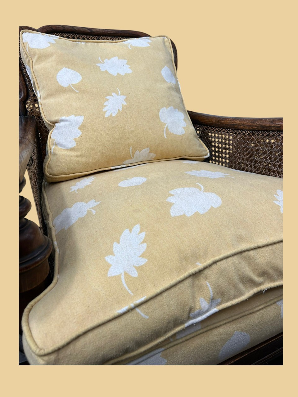 Conjunto de tresillo con dos butacones de ratán natural, con estructura de madera y rejilla artesanal. Incluye cojines en tono amarillo con estampado floral. Cómodo, resistente y perfecto para dar un toque cálido y vintage a cualquier espacio interior o cubierto.