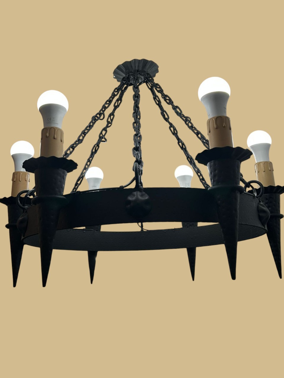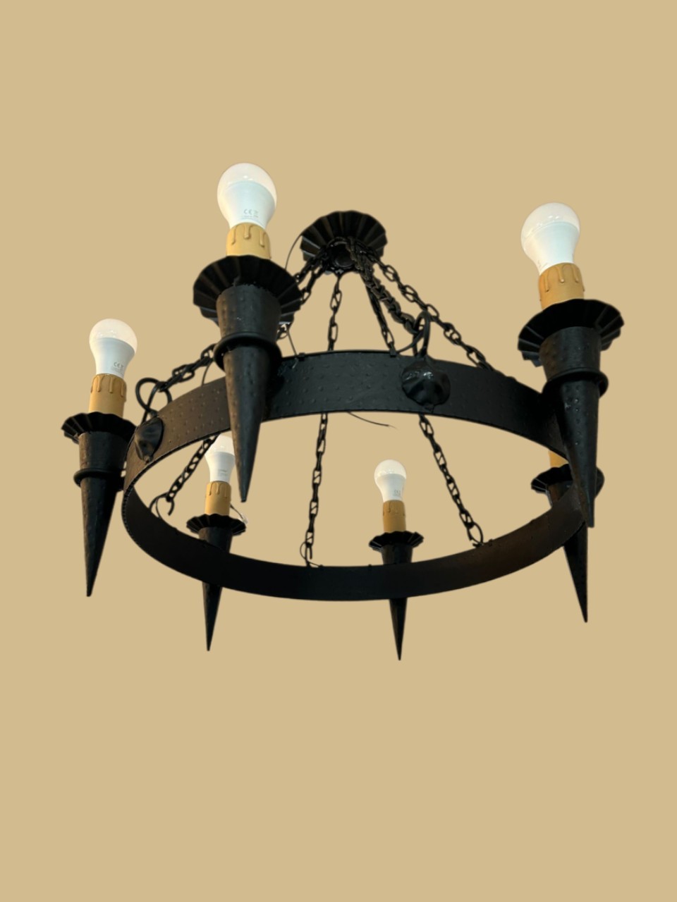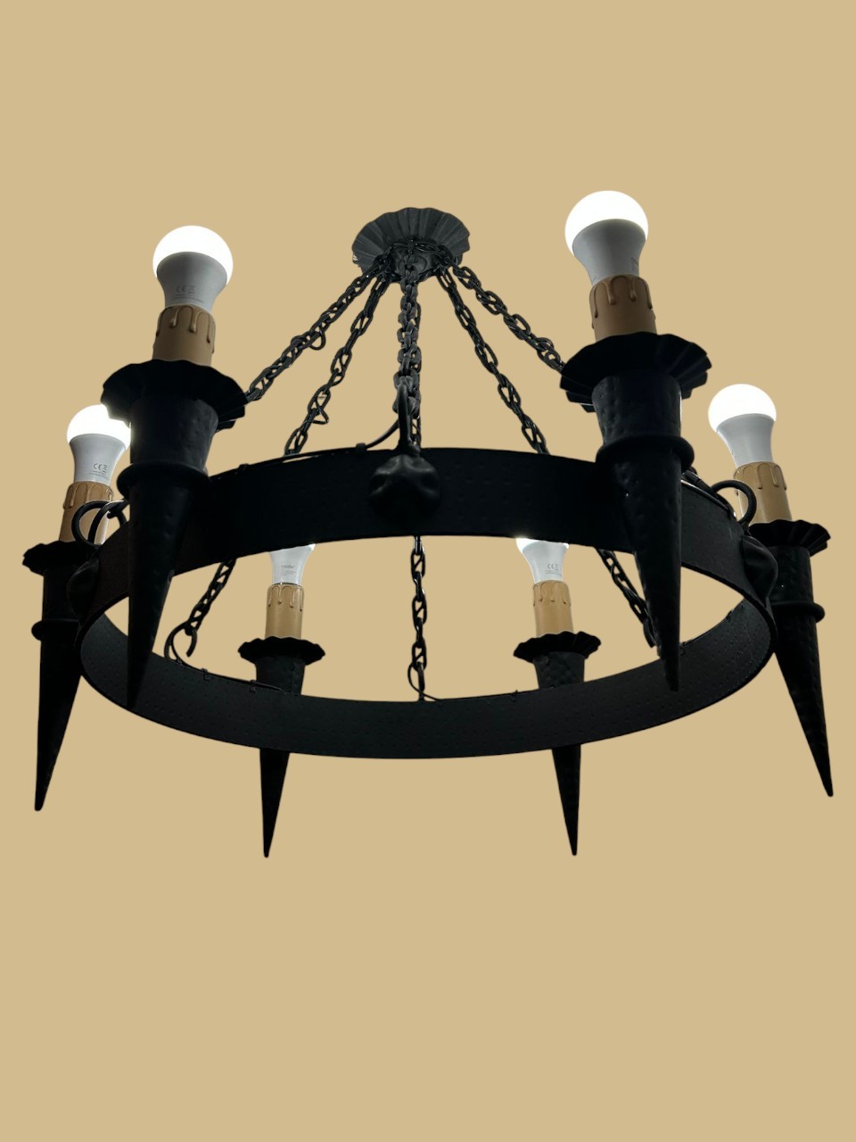 Lámpara de 6 luces de hierro forjado, con diseño resistente y estilo clásico. Ideal para iluminar y decorar salones, comedores o estancias con carácter rústico o industrial.