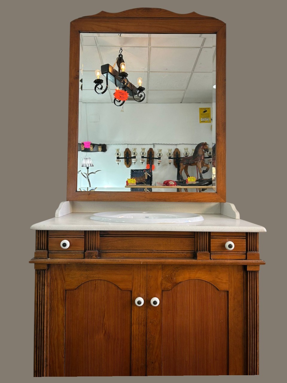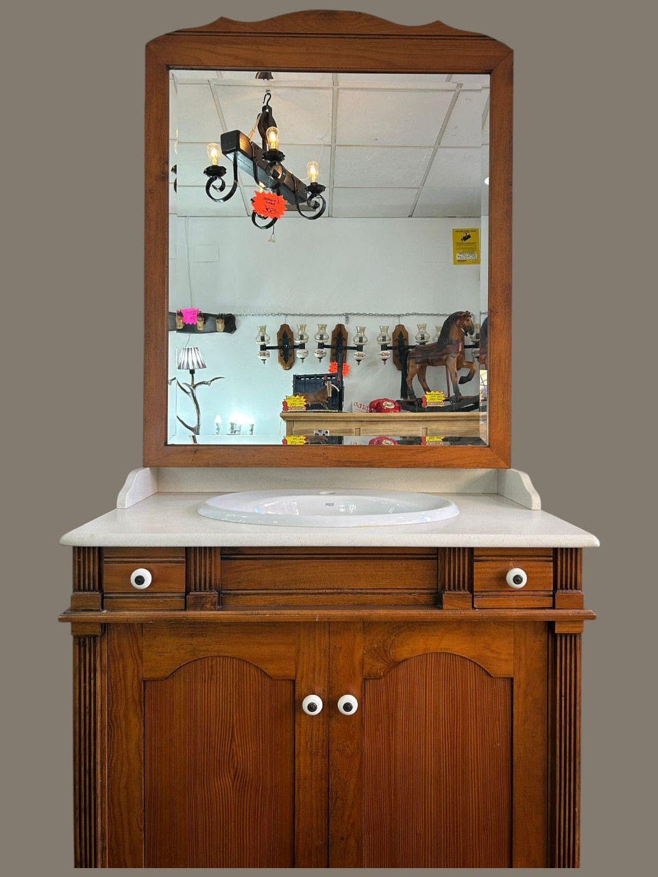 Conjunto de baño clásico, compuesto por mueble de madera con lavabo integrado de mármol y espejo a juego. Diseño elegante y funcional, con amplio espacio de almacenaje, ideal para aportar calidez y estilo tradicional al baño.