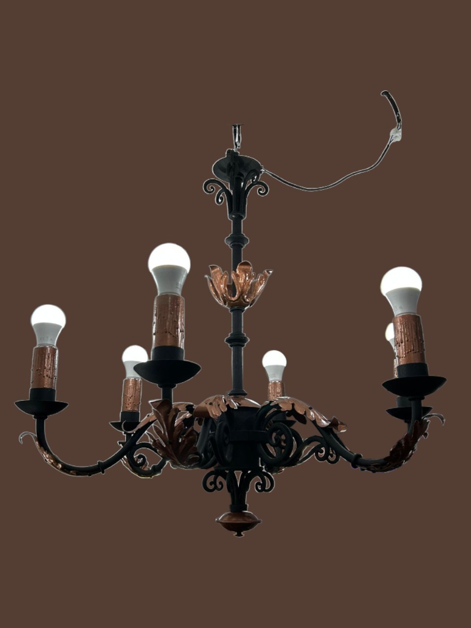 Lámpara de hierro forjado de 6 luces, con diseño clásico y robusto. Ideal para aportar carácter y una iluminación elegante a salones, comedores o espacios rústicos.