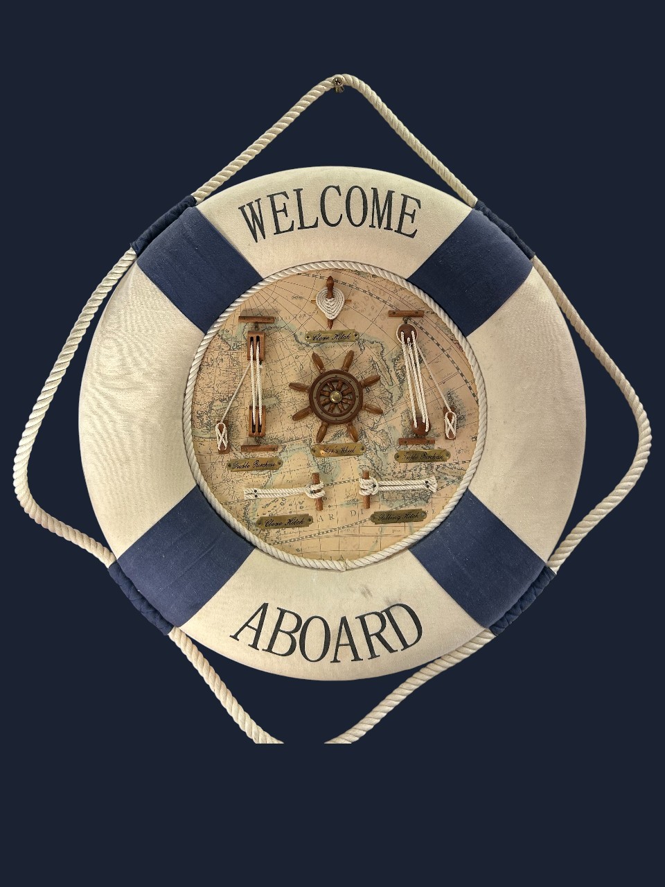 Decoración náutica de pared con forma de salvavidas, detalles marineros y texto “Welcome Aboard”. Ideal para aportar un toque costero y original a cualquier estancia.