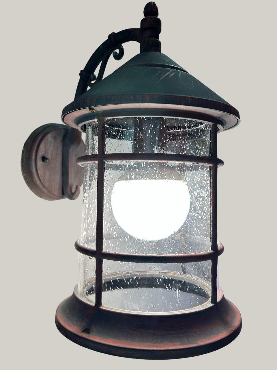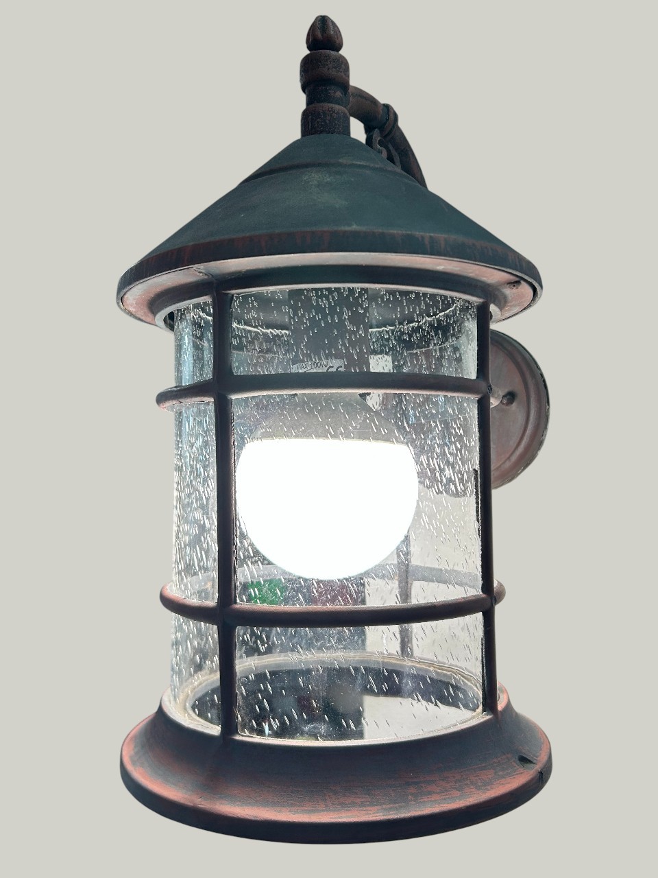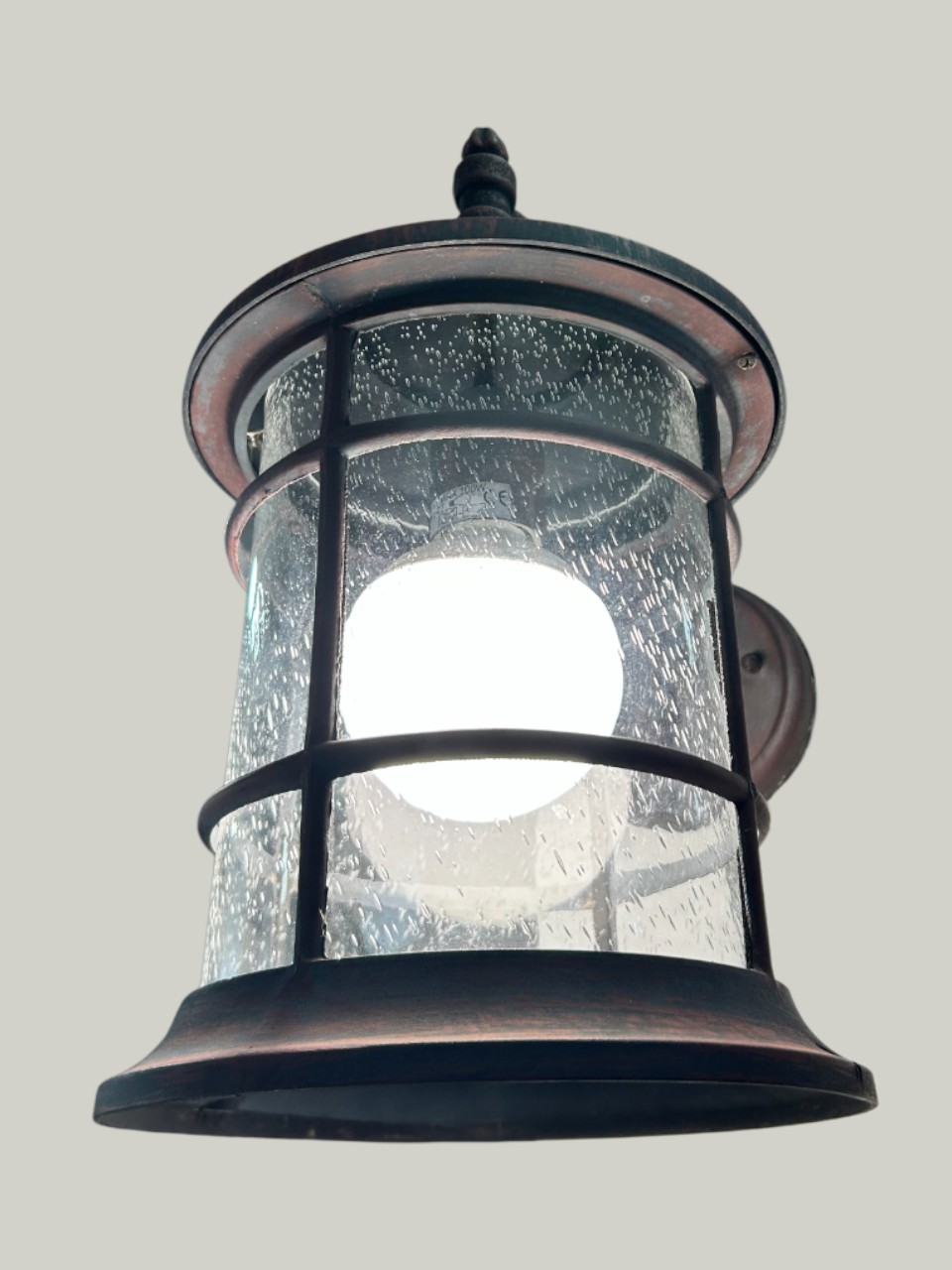 Aplique de lámpara de estilo clásico, fabricado en metal con acabado envejecido y cristal texturizado. Ideal para iluminar y decorar entradas, pasillos o exteriores cubiertos, aportando un toque rústico y elegante.