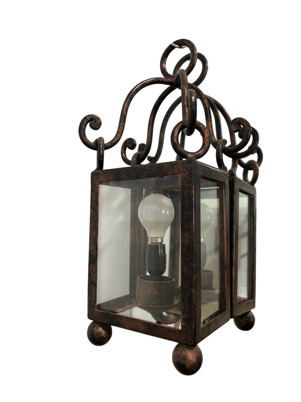 Lámpara que protege la bombilla en una estructura tipo farol o jaula, aportando un toque rústico y decorativo a cualquier espacio.