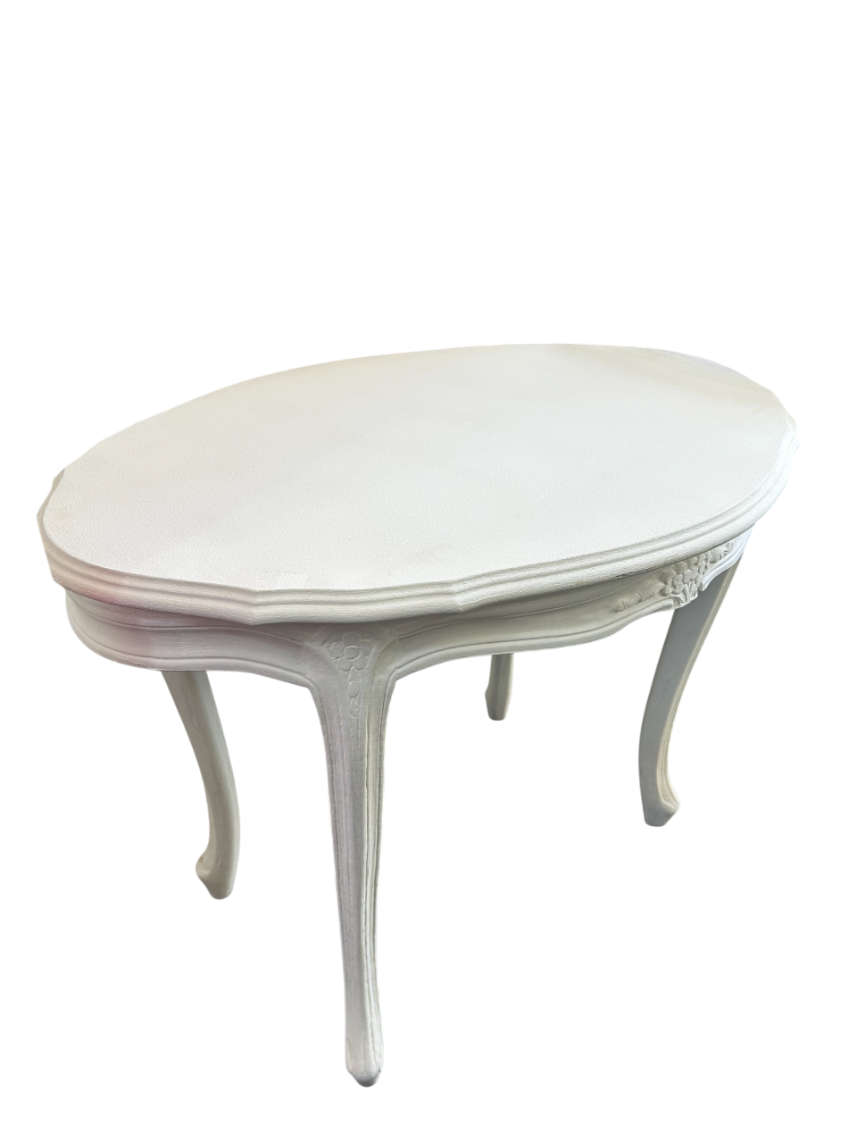 Mesa auxiliar blanca ovalada, ideal para el comedor o frente al sofá, aportando estilo moderno y funcionalidad a cualquier espacio.